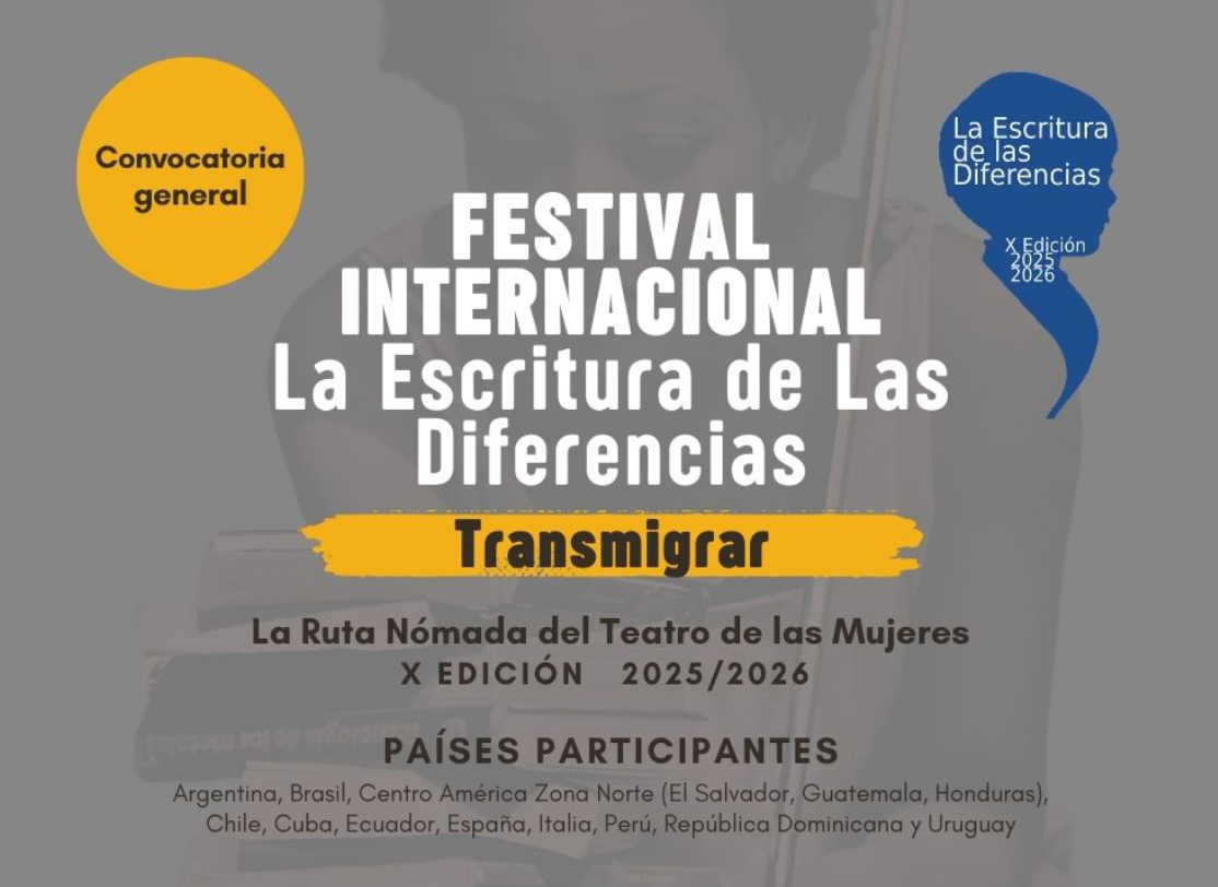 El Festival Internacional «La Escritura de las Diferencias» abre su convocatoria para el Certamen Internacional de Escritura Teatral, dirigido a mujeres dramaturgas de América Latina, Cuba, Italia y España. El objetivo es promover la visibilidad y el intercambio artístico de las mujeres en el teatro. El certamen está dirigido a dramaturgas que hayan estrenado o publicado al menos una obra profesionalmente, sin límite de edad. Las obras deben ser originales, no premiadas ni publicadas previamente, con una duración de 60 a 90 minutos y una extensión de 25 a 35 páginas (tamaño carta, Times New Roman, 12 puntos, interlineado 1.5).